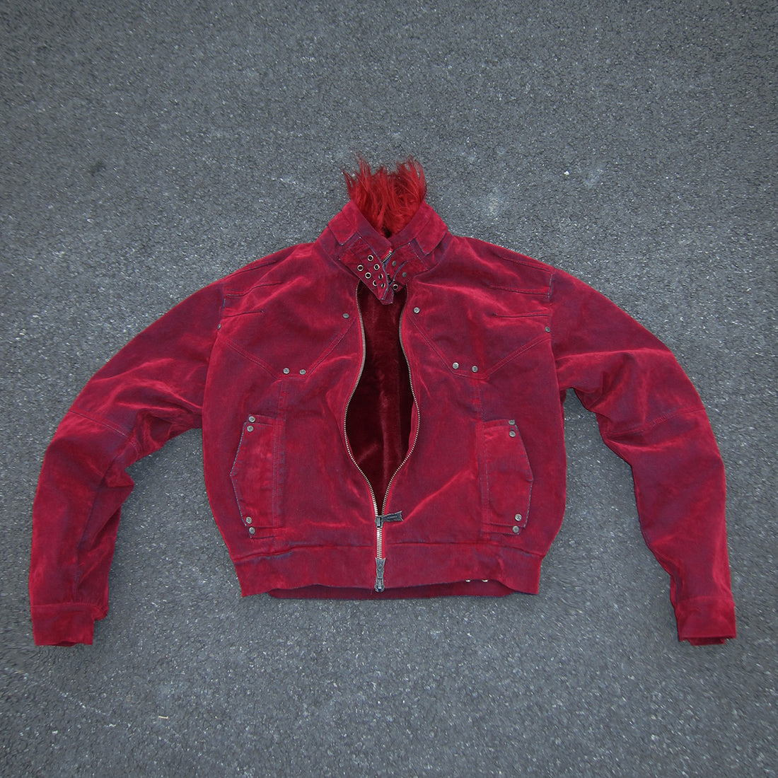 Flyerrer 25AW "Red Lips" American Vintage Distressed Denim Jacket w/ Patchwork Fur Collar