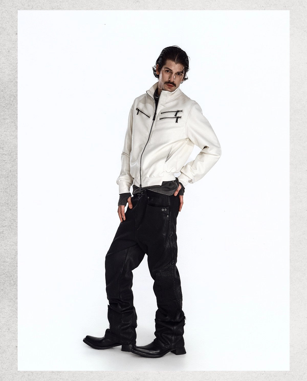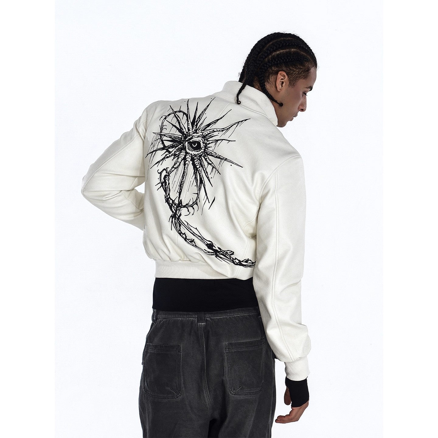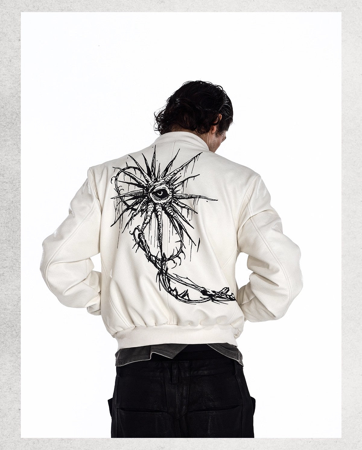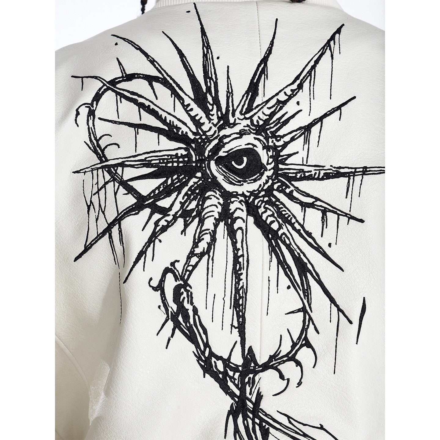 Flyerrer 25AW "Eye of Thorns" Short Leather Jacket with Black-White Contrast Embroidery